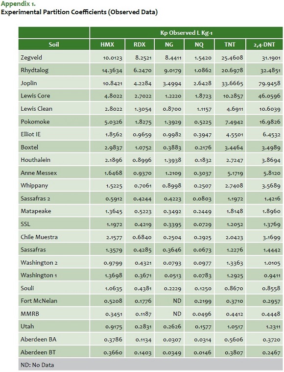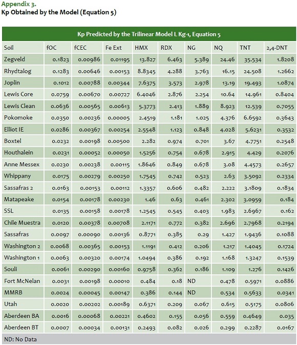 Some multilinear models were proposed to predict the partition coefficients obtained in Appendix 1 to identify the principal soil characteristics that influence the adsorption of munitions constituents (MC) of explosives in soils, and in this way to determine the fate of the explosives.