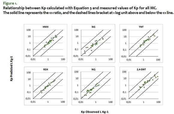 An additional conclusion is that the extractable Fe is a soil property that contributes to the adsorption of MC (HMX, RDX, TNT and 2,4-DNT) because the addition of Fe in the model showed small differences between the Kp values obtained experimentally and the Kp values from this model.
