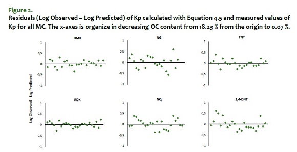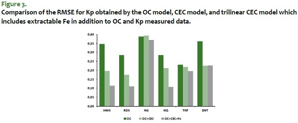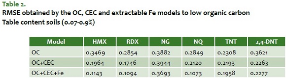 In addition table 1 presents the empirical parameters obtained of the model for HMX, RDX, NG, NQ, TNT and 2,4-DNT and table 2 shows the RMSE obtained by the OC, CEC and extractable Fe models to low organic carbon content soils (0.07-0.9%). From this table it is observed that for HMX, TNT and 2,4-DNT in these low OC soils the lowest RSME values are obtained by adding the extractable Fe component to the model. For the other MC the values are in the second place of fitting. NG depends mainly on the OC content of the soil based on the results obtained.