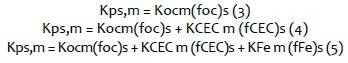 The partition coefficient Kp in L Kg-1 was calculated from the data as the relationship between the amount of MC sorbed per mass of soil and the concentration remaining in the solution after equilibration in the adsorption step. The parameters KOC, KCEC and KFe were calculated for all the chemicals and soils. They were obtained by fitting the multilinear model by the minimization of the log residuals square between the Kp calculated from the experimental data and the Kp obtained by the model using the Excel solver tool.
