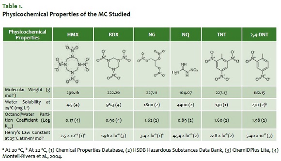 The fate of contaminants in the environment has been studied intensely since pollution became a public health problem. For this reason, many researchers have devoted their efforts to studying the physicochemical mechanisms of fate and transport phenomena. One group of these contaminants is the munitions constituents (MC). Contamination by MC is the result of incomplete detonation of explosives at operational ranges resulting in the heterogeneous dispersion of particulates. The toxic and mutagenic effects observed for many MC indicate a danger to biological receptors at down gradient sites (Kaplan & Kaplan, 1982; Robidoux et al., 2001, and Sunahara et al., 2009). In this sense, researchers have found that animals that ingest or breathe TNT evidence affections in the immune system (U.S. Department of Health and Human Services, 1995) and 2,4 DNT is toxic to aquatic organisms and cause long-term adverse effects in the aquatic environment (Material Safety Data Sheet OSHA, 2008). Millions of acres of land in the United States are believed to be contaminated by MC with the costs of assessment and remediation estimated to be in the billions of dollars and more than 2000 sites have been identified as potentially contaminated by energetic chemicals (U.S. General Accounting Office, 2003). In Canada training sites are known to be associated with activities involving RDX, HMX, and TNT (Hawari & Halasz, 2002). The contamination degree is extremely varied at these sites and the distribution is heterogeneous (Pennington, 2002). MC are one of the major causes of organic pollution (Travis, Bruce & Rosser, 2008) and some of them such as TNT, inhibit microbial activities in contaminated soil (Gong et al., 1999). In addition, millions of gallons of wastewater containing explosives are generated each year from production facilities (Walsh, Chalk & Merritt, 1973) and the wastewater after treatment still contain MC, becoming a second major source of surface and groundwater contamination. In Colombia this impact is not taking into account knowing that groups as the guerillas used mines in some places in the country. In order to minimize the environmental impact and maintain the balance between the environment, the needs of the military, and human health, it is necessary to understand the physicochemical processes that control the transport and the reactivity of the MC.