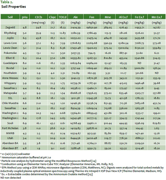 This study employed 25 soils collected from the U.S., Europe and South America to identify the major influences of soil properties in the adsorption-desorption process. They were obtained from the National Certified Repository of Soils from the University of Delaware in the amount required for each experiment. They have a pH range between 3.4 to 8.0, clay content percent between 4.0 to 43 % and total carbon content of 0.07 to 32 %. Soil properties were determined by the soil laboratory at the Plant and Soil Science Department at University of Delaware.