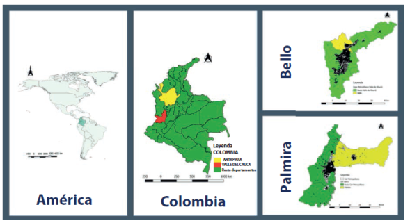The cities selected for this study were Bello (Antioquia) and Palmira (Valle del Cauca) (figure 1). Bello has 482,287 inhabitants (DANE, 2016), the largest population after the city of Medellín, in the metropolitan area of the Valle de Aburrá, in the westcenter of the country. On its behalf, Palmira is the second most populous city (310,594 people -DANE, 2016-) in the metropolitan region of the southern Valle del Cauca (not a legally constituted metropolitan area), in the southwest of Colombia.