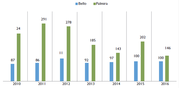 Figure 2 Homicides registered in the cities of Bello and Palmira, years 2010-2016