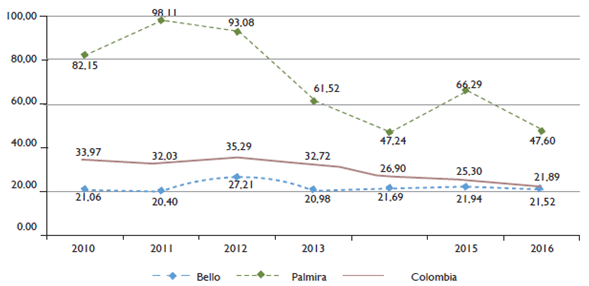 Figure 3 Homicide rate of the cities of Bello and Palmira, years 2010-2016