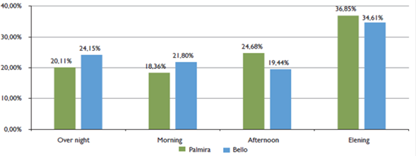 If the year-on-year behavior of homicides is observed by city, for Palmira 2011 was the most violent (292, rate: 98.11) and when there were the least was in 2014 (143, rate: 47.24). In Bello, the year with the most violent deaths was 2012 (117, rate: 27.21); otherwise occurred in 2016 (92, rate: 21.52. Figures 2 and 3). As for the time of day (temporary), more homicides were recorded in both cities at night, followed by the afternoon and early morning (figure 4).