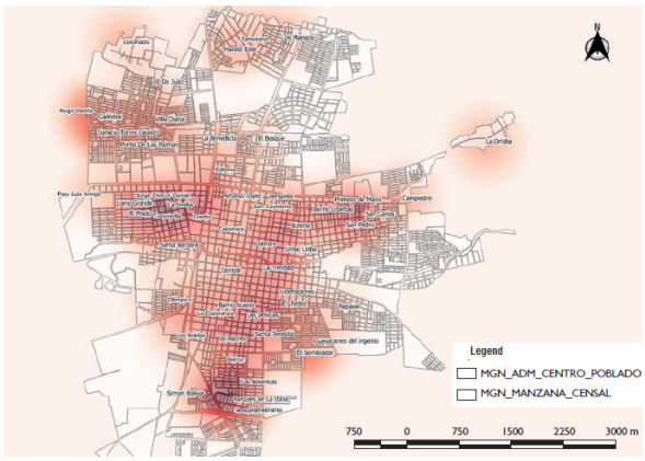 In the case of Bello, the neighborhoods with the highest number of homicides concentrated were Ciudad Niquía (54, 9 on average per year), Zamora (42), La Cabaña (27), Niquía Camacol (27), Medellín - Bogotá Highway (25) Gabriela (25), Prado (21), Par í s Central (19), Vereda El Pinar (18), Maruchenga (17), Vereda San Félix (17) and El Cóngolo (13). If the concentration of homicides is observed, it is evident that three axes are generated (figure 5): (1) in the north of the city with the neighborhoods Altos de Niquía, Niquía Camacol, Niquía Quitasol, Niquía Bifamiliar and Ciudad Niquía; (2) in the center, which particularly concentrates the largest number of homicides, the Central, Prado, Pérez, La Mesa, Cóngolo, El Carmelo, Las Farjas, Cairo and Manchester neighborhoods are located; and (3) in the south on the border with Medellín and at the beginning of the Highway to Bogotá, with the neighborhoods La Madera, La Cabañita, Acevedo, Zamora and Santa Rita.