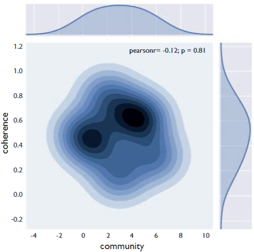 Meanwhile, when studying coherence regarding communities and cliques, it was found that its levels are high (0,20 to 0,50) (figure 11). The presence of very high values stands out (0.54) (figure 11) corresponding to cliques represented by neighbor hoods as Zamora, Maruchenga and Pachely and the community represented by purple (figure 7).