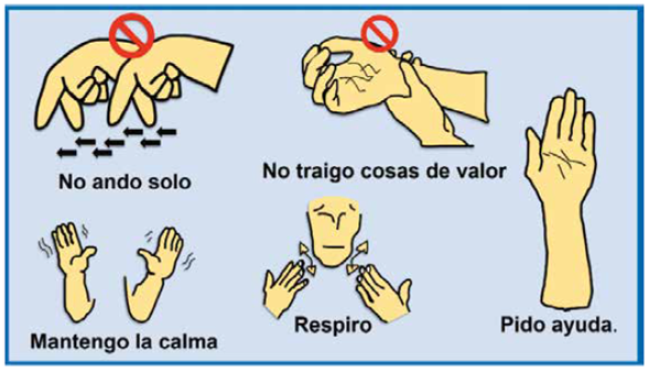 Establecer medidas básicas a seguir que permitan: mantener la calma, contener las emociones, retomar el control y tomar las medidas necesarias ante un hecho delictivo, con ello se evitarán posibles daños físicos y emocionales, como el forcejeo o recorrer vías no asertivas rápidas que agraven la situación, privilegiando siempre el valor de la vida y de la seguridad. Estas indicaciones se hacen a través de la comunicación emocional (Sebastián, 2001) y se concentran en una infografía que incluye cinco expresiones mímicas-corporales que en el lenguaje no verbal se entienden como acciones preventivas: no ando solo, no traigo cosas de valor, mantengo la calma, respiro y pido ayuda.