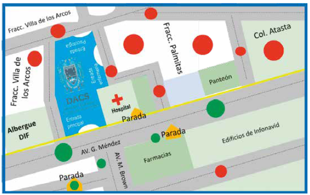 Figura 3 Croquis modificado de zonas seguras e inseguras cercanas a la universidad.