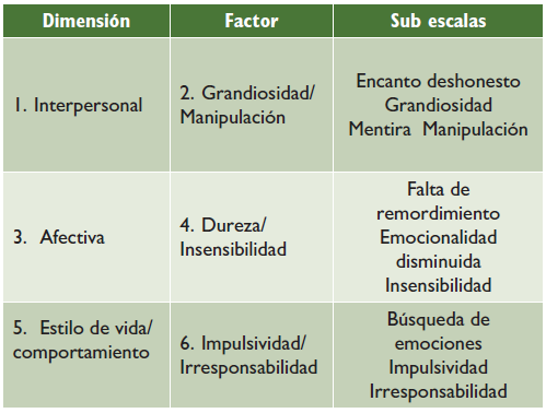 Hare (1991) propone, basado en la conceptualización de Cleckley (1976), autor clásico de la psicopatía, un modelo de cuatro dimensiones: afectiva, interpersonal, estilo de vida y conducta antisocial. En el 2003 adapta su modelo para adultos en adolescentes, desarrollando el instrumento Psychopathy Checklist: Youth Version (PCL: YV; Forth et al., 2003), que consiste en una entrevista semiestructurada individual, idealmente video- registrada, y, más producción de información colateral, se identifica la presencia de atributos en una pauta de chequeo. El modelo de Hare (1991) de psicopatía consiste en cuatro dimensiones con características específicas: la dimensión afectiva involucra manejo de la imagen, sentido grandioso de sí mismo, egocentrismo, utilización de la mentira y manipulación. La dimensión interpersonal contempla la limitada capacidad de empatizar, experimentar arrepentimiento y culpa, vincularse profundamente con quienes le rodean e incapacidad para aceptar la responsabilidad de las acciones. La dimensión estilo de vida involucra la necesidad de estimulación y tendencia al aburrimiento, orientación parasitaria, falta de metas realistas irresponsabilidad e impulsividad. En cuanto a la conducta, se consideran los problemas conductuales precoces, conducta delictual, versatilidad, dificultad del manejo de la rabia y el no cumplimiento de las sanciones.