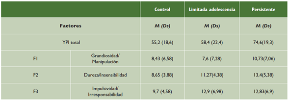 Conforme a la hipótesis planteada, se observan diferencias estadísticamente significativas entre el grupo control y el grupo persistente en relación con las características psicopáticas evaluadas, tanto en la escala general (YPI) como en el factor 2 de Dureza/ Insensibilidad, más específicamente, en las subescalas de Falta de Remordimiento e Irresponsabilidad. No se advierten diferencias significativas entre el grupo control y el grupo limitado a la adolescencia; tampoco entre el grupo persistente y el limitado a la adolescencia. Por tanto, la hipótesis planteada no es posible de sostener en su totalidad; aun así, es posible considerar al grupo persistente una población distintiva en contraste con jóvenes que no infringen la ley en el desarrollo de su personalidad.
