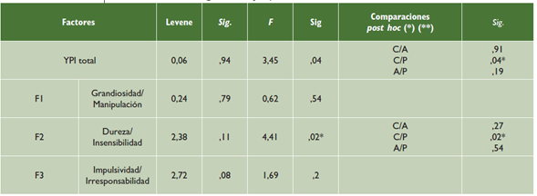 Tabla 3 Análisis de varianza Factores YPI según complejidades delictivas.