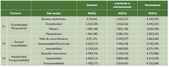 Es posible interpretar este resultado señalando que efectivamente los adolescentes caracterizados como persistentes a través del modelo MMIDA pertenecen a una población con mayores niveles de características de personalidad psicopática general y desarrollan mayores niveles de dureza e insensibilidad, sin sentir remordimiento por sus acciones, además de mantener conductas irresponsables, esto a diferencia del grupo control. Esto cabría de esperar en jóvenes persistentes en el delito, considerando que se inician precozmente en estas conductas, inclusive antes de los 13 años, y que además presentan: polimorfismo, aumento de gravedad o especialización delictiva, auto reporte delictivo, compromiso o enganche delictivo y presencia de variables psicológicas asociadas a la persistencia de la conducta delictiva, además de no reportar ansiedad al momento de cometer ilícitos (Pérez-Luco, Lagos, et al., 2014).