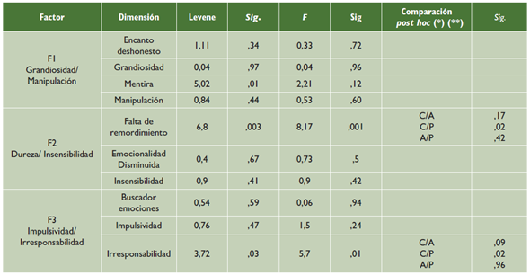 Según dimensiones, se advierten diferencias significativas en la dimensión afectiva Dureza/Insensibilidad (F (2, 41) = 4,41, p = ,02) específicamente entre grupo persistente y control, siendo la media poblacional mayor en el grupo persistente (véanse las Tablas 2 y 3).