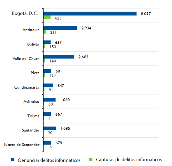 Al observar esta información a nivel departamental, se encuentra que Bogotá es la entidad territorial con mayor número de denuncias por delitos informáticos, con 8.097, seguida de Antioquia con 2.934 denuncias y Valle del Cauca con 2.683. Asimismo, Bogotá es la entidad territorial con mayor número de capturas por delitos informáticos, con 625, seguida de Antioquia con 211 capturas y Bolívar con 153.