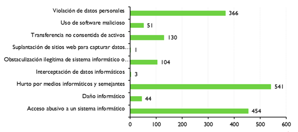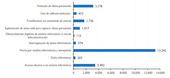Con base en la información suministrada por la Dirección de Política y Estrategias de la Fiscalía General de la Nación, obtenida del Sistema Penal Oral y Acusatorio (SPOA), para el 2019 se recibieron 23.917 denuncias de los delitos tipificados en la Ley 1273 de 2009 en materia de los delitos informáticos. De estos últimos, 13.242 denuncias corresponden a hurto por medio informático (55.37%), seguidas por acceso abusivo a un sistema informático con 3.492 denuncias (14.6%) y violación de datos personales con3.178 denuncias (13.29%) (Corporación Excelencia en la Justicia, 2019)