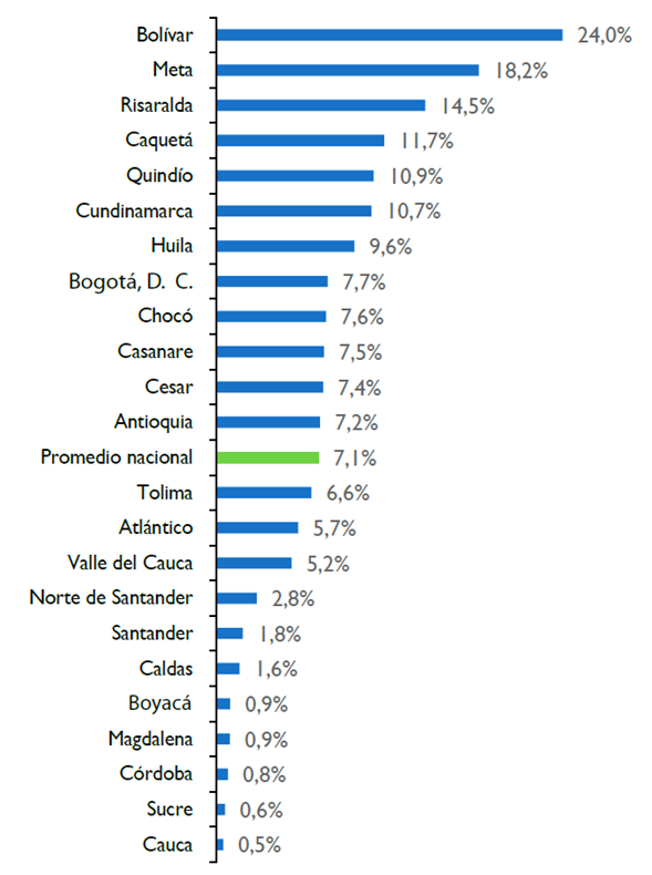 Asimismo, estos indicadores se interpretan como la probabilidad de ser capturado por la policía al cometer un delito informático; así, la probabilidad de ser capturado en Bolívar por cometer un delito informático es del 24 %, mientras en Risaralda es del 14%.