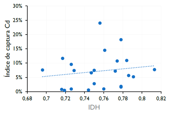 El coeficiente de correlación entre el índice de captura por delitos informáticos y el indicador de acceso es de 17.49%; el coeficiente de correlación entre este índice de captura y el índice de desarrollo humano (IDH) es de 15.87%; mientras que el coeficiente de correlación entre el índice de captura y la población estimada es de −1.54% (véanse Figuras 4, 5 y 6).