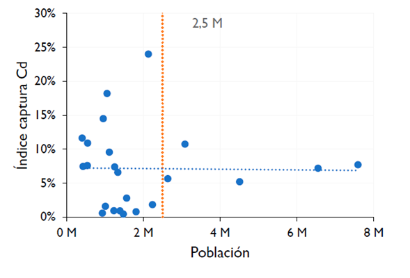 Al observar la Figura 6, se identifica un grupo de datos, aquellos que se encuentran con una población menor a 2.500.000 habitantes3. Si bien el coeficiente de correlación entre el índice de captura Cd y la población es cercano a 0, los análisis a nivel departamental también se realizaron a partir de este subgrupo, ya que se supone que los miembros que lo integran tienen un desempeño similar frente al índice de captura por delitos informáticos.