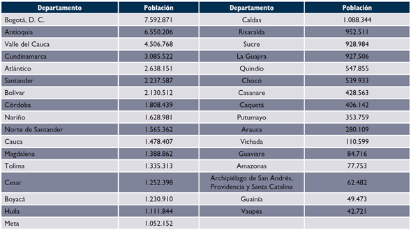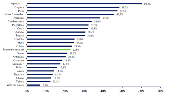 De estos grupos, los principales centros urbanos son Antioquia, Atlántico, Bogotá, D. C., Cundinamarca y Valle del Cauca; los departamentos con bajo Cd: Boyacá, Caldas, Cauca, Córdoba, Magdalena, Norte de Santander, Santander, Sucre y Tolima, y los que presentan alto Cd: Bolívar, Caquetá, Casanare, Cesar, Chocó, Huila, Meta, Quindío y Risaralda.