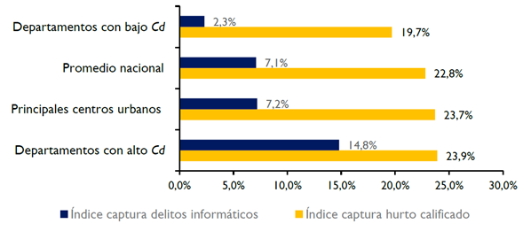 Se observa que, para la mayoría de las entidades territoriales, el indicador de captura por hurto calificado es mayor que el de delito informático, siendo las únicas excepciones Bolívar y Risaralda; lo que sustenta la hipótesis de que la ejecución de la Ley de Delitos Informáticos, de 2009 ha sido menos eficiente, al menos en la mayoría de los departamentos, si se compara con el delito de hurto calificado.