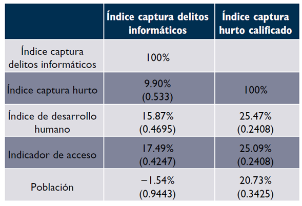 Continuando con la comparación de estos índices, al analizar las correlaciones de variables como el indicador de acceso, la población y el índice de desarrollo humano, se encuentra que estas variables no presentan correlaciones significativas a un nivel de confianza del 95%. Por tanto, se podría afirmar que estas variables no tienen relación con la capacidad o eficiencia de las fuerzas policiales de las entidades territoriales, para realizar capturas en delitos tipificados en la Ley 1273 de 2009 o delitos de hurto calificado, indicando que son otros aspectos y no los que suelen asociarse a un mayor desarrollo (mayor población, desarrollo humano o inclusión financiera) que hacen que las fuerzas policiales sean más eficaces.