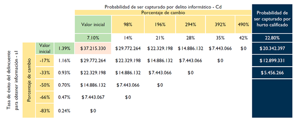 Al analizar las variables (k = número de cuentas atacadas y F = multa por cometer estos delitos) de la ecuación de beneficios del ciberdelincuente, se denota que estas son difíciles de modificar por la política pública. La tendencia de k es aumentar a medida que existan más personas bancarizadas y la tendencia de F depende de la política criminal de Colombia; por lo cual, el reto es integrar estas dos variables en la agenda nacional para mejorar la capacidad operativa de los entes de control y policivos. Por ello, se encuentra que las variables más factibles de modificar mediante propuestas de política pública son s1 (tasa de éxito en la obtención de información) y transversalmente, la probabilidad de ser capturado por delitos informáticos Cd. Al combinarse, se requerirían cambios factibles para que las ganancias del ciberdelincuente en un año sean cercanas a 0, de acuerdo con nuestro análisis, manteniendo todo lo demás constante (Principio de Pareto).