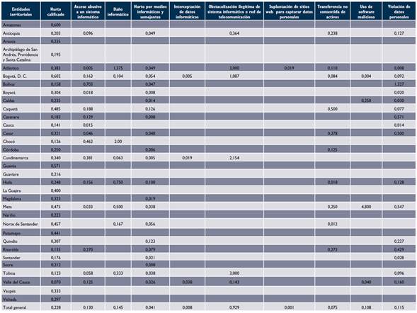 En el caso de los departamentos de Bolívar y Risaralda, se observa que el indicador para el “acceso abusivo a un sistema informático es mayor al indicador para hurto calificado5, y es el principal delito que permite que Cd sea mayor al indicador de hurto calificado. Sería de interés observar y conocer los procedimientos que realizan en estos departamentos frente a este tipo de delitos, para así identificar buenas prácticas que se puedan compartir con las otras entidades territoriales.