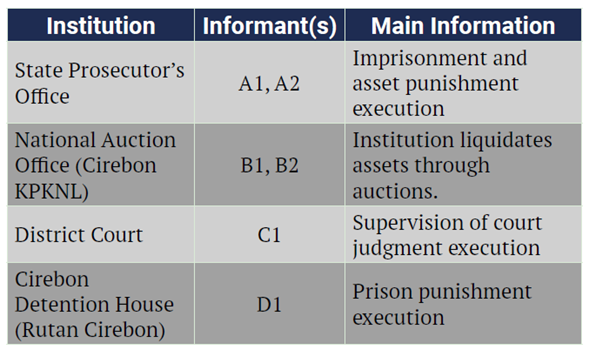 Primary data were obtained from interviews during 9 -13 January 2023, and secondary data were obtained by reviewing case files and references. The informants involved in the interviews were officials directly involved in the execution of punishment in the CSI case, namely: Interviews A list of questions was prepared with specific topics on the current conditions in asset recovery execution, auction financing for asset recovery, and coordination between institutions in execution. The informants were selected by each institution; they received orders from the institution, which is a shortcoming in this research. However, all informants were confirmed to have handled executions in CSI cases. A review of regulations and references has been conducted in relation to asset recovery regulations and execution in Indonesia. The data collected were then reduced based on three sub-problems in the research assumptions: formulation of asset recovery regulations, state financial support in asset forfeiture auctions, and inter-institutional coordination in the criminal justice system. The data are displayed on Tables, in excerpts, and regulatory resumes. Content analysis was used in the discussion, and the data displayed in the results were identified on three topics that show how regulations and agencies respond to cases with new patterns, such as CSI. This method will lead to conclusions and recommendations for solving the problem of execution stagnation in future investment crime cases.