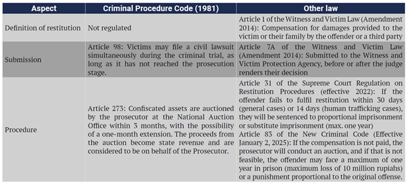 The Code of Criminal Procedure (KUHAP), as the primary legal framework for trial practices, does not currently regulate restitution. This law was established in 1981 with the aim of protecting the rights of suspects due to widespread cases of torture. Therefore, its orientation is focused on safeguarding the rights of the accused. Asset forfeiture, in this context, does not intend to restore the rights of victims through restitution but rather serves as a punishment that contributes to state finances. The Law on the Indonesian Witness and Victim Protection Agency (LPSK), which first introduced provisions on restitution, was enacted in 2006. It was later revised in 2014 to accommodate restitution requests after a court verdict had been issued. This regulation was introduced because the LPSK was initially only based in Jakarta, the capital city. When the court grants a restitution request, the perpetrator is required to make an immediate voluntary payment, or else they may face an additional punishment of a maximum of one-year imprisonment. According to the law that will take effect on January 2, 2025, the consequence would be the seizure of the perpetrator’s assets and subjecting them to the same imprisonment period if asset seizure is not feasible.