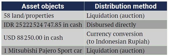 This Case was recorded as No. 193/Pid.B/2017/PN Sbr and determined an unusual decision, confiscating the defendant’s assets not for the state but for the victim. Article 273 of the Indonesian Criminal Procedure Code only regulates the auction of confiscated goods for state purposes, which means that the auction proceeds become part of the state’s assets. In this decision, many assets can be distributed to the victims, as shown on Table 1 and 2. Five years after the decision was rendered in 2017, it was recorded that as of 2022, the data had found 3 868 victims. The panel of judges in the CSI case provided assurance of asset recovery for the victims, increasing the likelihood of restitution through the seizure of assets as a coercive measure. However, the execution of asset recovery has been significantly delayed and preceded by the completion of prison sentences for both perpetrators, which occurred on February 21, 2023. The main issue pertaining to asset recovery is the lack of financial support from the KPKNL (Ministry of Finance).