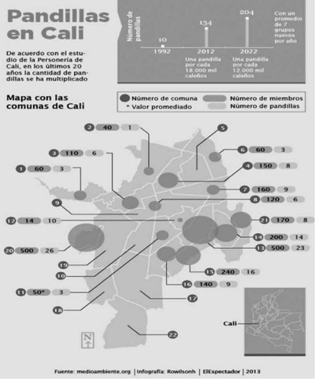 Es perentorio afirmar que Colombia es un país que durante gran parte de su historia ha estado inmerso en un profundo conflicto armado interno. No obstante, la ciudad de Cali no es un territorio afectado directamente por el mismo, dado su alto nivel de urbanización. Su inseguridad está ligada a factores aledaños a la transición de pandillas (conformadas en su mayoría por jóvenes) al crimen organizado. En 17 de las 22 comunas hay presencia de estas organizaciones que exacerban los niveles de violencia a través del hurto callejero, el sicariato y las disputas territoriales desde 'fronteras invisibles'2El País, 2014). En la Figura 1, se destaca la distribución de las pandillas en Cali para el año 2013. De acuerdo a estimaciones, para el 2022 la ciudad tendrá un aproximado de 204 pandillas.