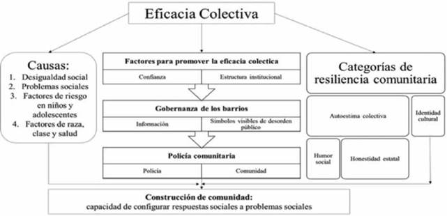 Finalmente, con la suma de todos estos elementos, variando en formas, intensidades y órdenes según la particularidad de cada contexto, se genera lo que Sampson denomina como la "construcción de comunidad". Para este autor, la comunidad es "la capacidad que tiene un colectivo para dar respuestas sociales a problemas sociales" (2004, p. 244). Se hace un fuerte hincapié en la importancia de la eficacia colectiva como un insumo orientador del diseño e implementación de políticas públicas mejor construidas, dadas las aportaciones de los propios actores que demandan dichos procederes. No obstante, la eficacia colectiva es inútil resolviendo problemas estructurales, puesto que estos son obligación directa y primigenia del Estado.