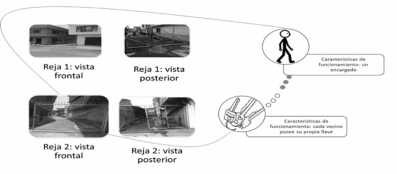 Lo que se pudo determinar como rasgo característico del barrio, es que este posee una forma cuadriculada, materializada en cinco cuadras de manera vertical y cinco de manera horizontal11. En el proceso de observación, se registraron cuatro enrejados sobre dos cuadras, los cuales estaban abiertos hasta las 9:00 p. m. Posteriormente fueron cerrados, pero cada uno funcionaba de manera distinta: el primero (que se denominará reja 1) fue cerrado por una de las vecinas residentes mientras que el segundo reproduce este mismo proceso por distintos habitantes de la cuadra enrejada. La particularidad radica en que esta es abierta de manera constante; lo que se observó, fue que cada habitante posee su propia llave. De esta manera, se logró comprender que el funcionamiento de ambos enrejados es independiente. En el primero, la regulación es ejercida directamente por una persona encargada; mientras que en el segundo, cada vecino residente debe poseer su propia llave. En la Figura 4 se retrata el sistema de seguridad reseñado.