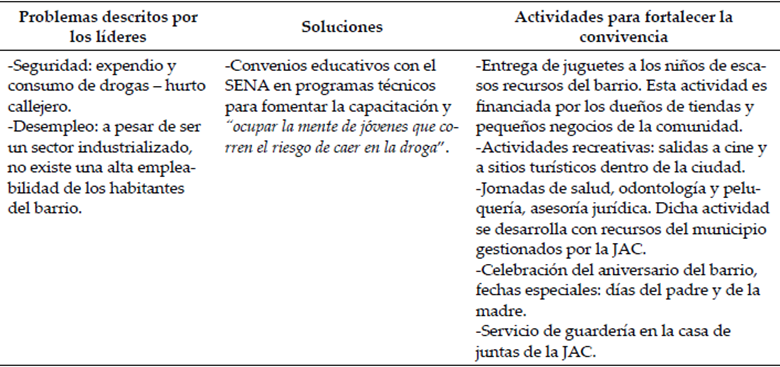Como valor agregado, aparte de la solicitud de reseña sobre los motivos por los cuales se instalaron las rejas 1 y 2, se indagó por actividades que rebasen esta estrategia de seguridad encaminadas a la construcción de comunidad en sintonía con la definición de Sampson. De esta manera, se orientó la discusión hacia tres aspectos clave: problemas del barrio, soluciones propuestas y actividades para fortalecimiento de la convivencia. Lo dicho se postula partiendo de un principio lógico: los enrejados en sí mismos no mantienen un barrio unido y seguro, es necesario el desarrollo de acciones colectivas aledañas que fortalezcan este emprendimiento. De esta manera, producto de la información recaudada se desprende la Tabla 1.