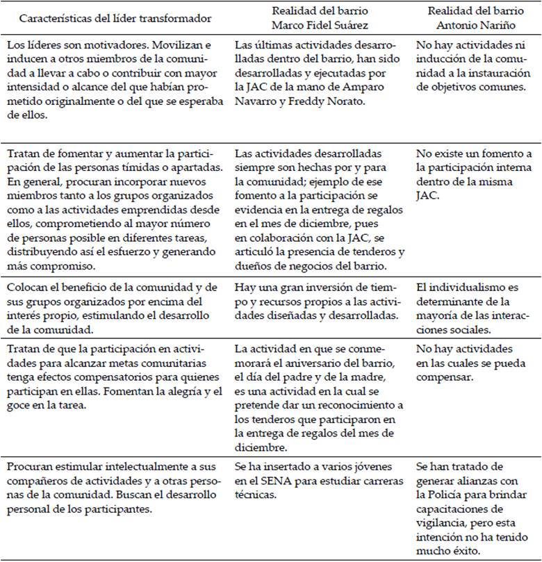 A continuación se introducirán las características del líder transformador a la realidad de los barrios BMFS y BAN para lograr comparar sus discrepancias.
