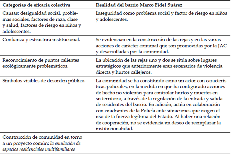 Por otro lado, con la evidencia empírica recaudada por las entrevistas y la observación pasiva, se hace innegable el uso de diferentes categorías de la teoría de la eficacia colectiva al servicio de la construcción de ambientes más seguros por parte de los residentes del BMFS. Elementos propios como la configuración de redes de comunicación e infraestructura institucional, el reconocimiento de puntos problemáticos que atentan contra el mantenimiento de la normalidad transitando hacia la aparición de conflictos que se resuelven de manera violenta, sumado a la identificación de símbolos visibles de desorden público, en donde la comunidad toma un rol de control policial a través de la cooperación o reemplazo de entidades estatales que juegan este rol, son de suma utilidad para comprender el proceso de eficacia colectiva donde el conjunto de habitantes resuelve socialmente lo que se constituía como un problema colectivo, generando así una transición del vecindario a la comunidad. A continuación la Tabla 3 amplía lo expresando en este párrafo.