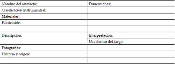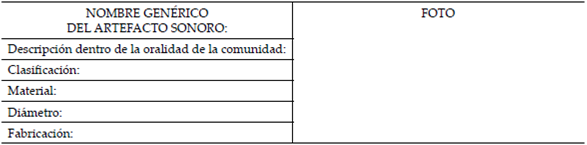 Las fichas de sistematización propuestas en este proyecto buscaron ser una guía para la clasificación de los artefactos sonoros como parte de una expresión cultural. La intención de la categorización fue la de presentar información de la clasificación organológica para explicitar, paralelamente, cualidades propias de los artefactos encontrados. Esto incluye la información de las fuentes vivas como la ideología étnica asociada al accesorio, uso en el juego e interpretación según el caso.10 Desde esta perspectiva se buscó la manera más adecuada, incluyente y práctica para la difusión en la comunidad.