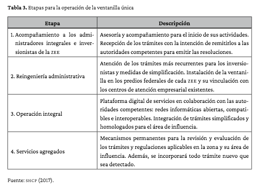 Es importante destacar que la autoridad federal, en conjunto con la Comisión Nacional de Mejora Regulatoria (Cofemer) y con el apoyo del Banco Mundial, han implementado un programa de cuatro etapas para la operación de la ventanilla única, tal como se observa en la tabla 3.