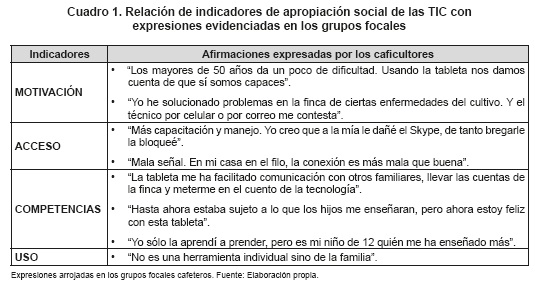 Para poder catalogar y ordenar la información, el análisis se basó en una batería de indicadores relacionados con la apropiación social de las TIC, supuesto que está fundamentado en diferentes metodologías relacionadas con la apropiación desde la Sociedad del Conocimiento, la Comunicación y la participación ciudadana. Este análisis de corte cualitativo busca ser más amplio que una revisión de corte cuantitativa frente al uso, donde la cifra numérica puede arrojar un resultado importante, pero la manifestación verbal y experiencial del caficultor juega un papel protagónico para explicar la importancia de estos procesos sociales de integración entre la tecnología, la participación y el desarrollo social. La metodología llevó entonces a revisar los indicadores de apropiación de TIC de la UNESCO, con los cuales se establecieron los rangos de evaluación para la experiencia cafetera; centrados en pilares como la motivación, acceso, las competencias y el uso. A continuación se relacionan algunas expresiones y afirmaciones evidenciadas en los grupos focales.