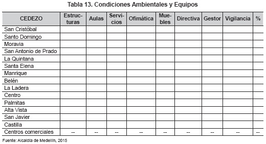 La estructura organizacional es sencilla, aunque se requiere personal para la gestión de archivo y seguridad documental (Alcaldía de Medellín, 2011). El aspecto a mejorar es el de acceso por seguridad, ya que han ocurrido eventualidades en las que se suspenden los servicios por orden público. El centro n.º 13 es el más eficiente, el n.º 12 comparte las instalaciones con la Alcaldía lo cual representa una vulnerabilidad ante riesgos de cambios políticos en los que el programa depende de la voluntad política, además posee puntajes muy bajos en los compromisos como en los diagnóstico y Evaluación de Cursos; el centro n.º 1 está por debajo del 50 % del cumplimiento, pero es fuerte en Planeación, Reporte y Base de Datos; el centro n.º 11 presenta baja densidad de datos e incumplimiento de dos procesos: Inducción y Seguimiento a Convocatoria, y está por debajo del 50 % de cumplimiento.