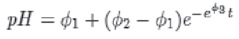 Donde t está medido en horas, y ø1 es el valor asintótico al cual converge el pH cuando t → ∞, ø2 es el valor inicial de pH a la hora cero, y el valor ø3 es el logaritmo de la tasa de decrecimiento.