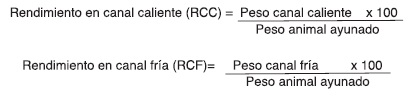 Rendimiento en canal. Los animales fueron identificados individualmente en el predio de origen; el registro de los pesos vivos (PV) se realizó al ingresar a la planta, en las básculas de la Central Ganadera. Posterior al beneficio se marcaron las canales y se pesaron individualmente en una báscula de riel electrónica calibrada (marca Medigan®, modelo monorriel Steel, Colombia), situada al final de la línea del beneficio, tomando los pesos de la canal caliente para cada animal. Las canales pasaron a refrigeración en cámaras frigoríficas (Ref. S287751-P6-E31), a una temperatura entre 2-4 °C; 24 horas después, previo al desposte, se registraron los pesos de la canal fría de cada animal. Con estos datos se calcularon los rendimientos en canal fría y canal caliente, usando las siguientes relaciones (Valdés A, 2002; Hernández et al., 2009):