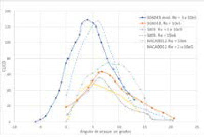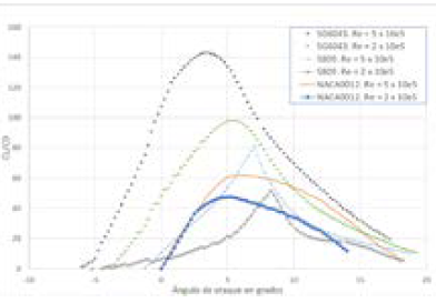 En la figura 1se muestra el desempeño aerodinámico comparativo de los tres perfiles principales identificados en la tabla 1, según la literatura, para varios números de Reynolds (Re).