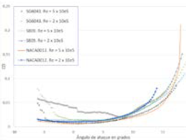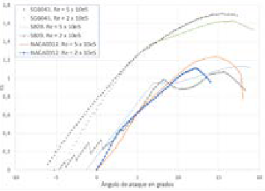 Por otra parte, un ejemplo de un perfil ampliamente usado en turbinas pequeñas, sin ser diseñado para ese fin, es el NACA0012. Kishore et al. (2013) mencionan que el coeficiente de sustentación máximo para este perfil decrece al reducir el número de Reynolds, a la vez que el arrastre se incrementa. Esto implica que la relación CL/CD cae abruptamente para números de Reynolds bajos, tal como se ilustra en las figuras 1 y 2. Por esta razón se esperaría un desempeño bajo en turbinas eólicas de pequeña escala construidas con este conocido perfil.
