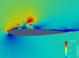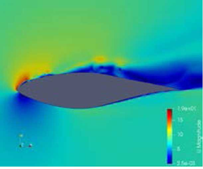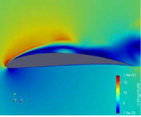 Una visualización de la velocidad del flujo en un ambiente a Re = 5 x 105, con un ángulo de ataque de 15 ° se muestra en las figuras 5, 6 y 7, para NACA 0012, SG6043 y S809, respectivamente. En ellas se puede observar los efectos de la geometría de cada perfil sobre el flujo.