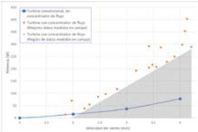 Figura 8 Potencia de una turbina eólica convencional con y sin concentrador de flujo, en rangos de baja velocidad de viento.