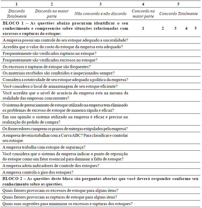 No segundo bloco de questões do questionário aplicado para coleta de dados foram feitas perguntas abertas. A primeira questão avaliou quais fatores provocam os excessos de estoque e o respondente concluiu os seguintes fatores: compras obrigatórias para fins de atingimento de metas ou cumprimento de acordos com fornecedores; importações com alta do dólar ou grandes cargas tributárias, deixando a mercadoria sem competitividade em relação aos concorrentes. A segunda questão avaliou quais fatores provocam as rupturas de estoque e segundo o respondente a falta de controle de entrada e saída de mercadorias são os fatores.