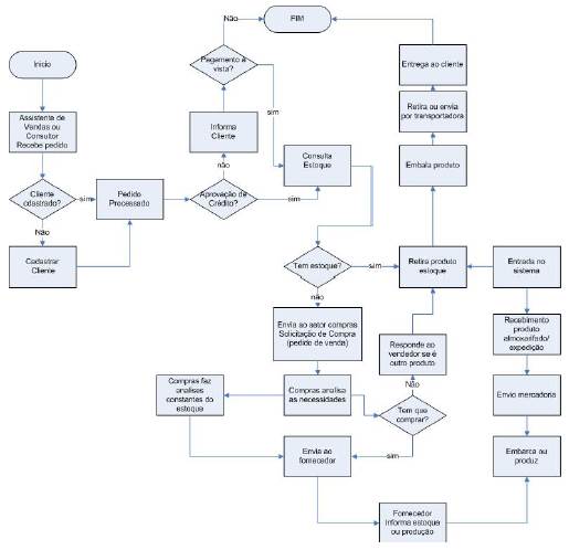 O fluxograma apresentado na Figura 1 representa o processo das principais atividades da empresa partir do contato do cliente com o assistente de vendas ou consultor de vendas, até a entrega da mercadoria para o cliente. Os processos internos consistem em inicialmente consultar se o cliente possui cadastros, e em não havendo, cadastra-se o cliente e submete-se o cadastro à avaliação de crédito. Após aprovado o crédito, encaminha-se o processo de compra para consulta do estoque ou solicitação de compra para o setor responsável, quando não disponível em estoque. Não havendo a concretização da liberação de crédito, o cliente poderá realizar a compra com pagamento à vista, não havendo esta possibilidade, a negociação é encerrada.